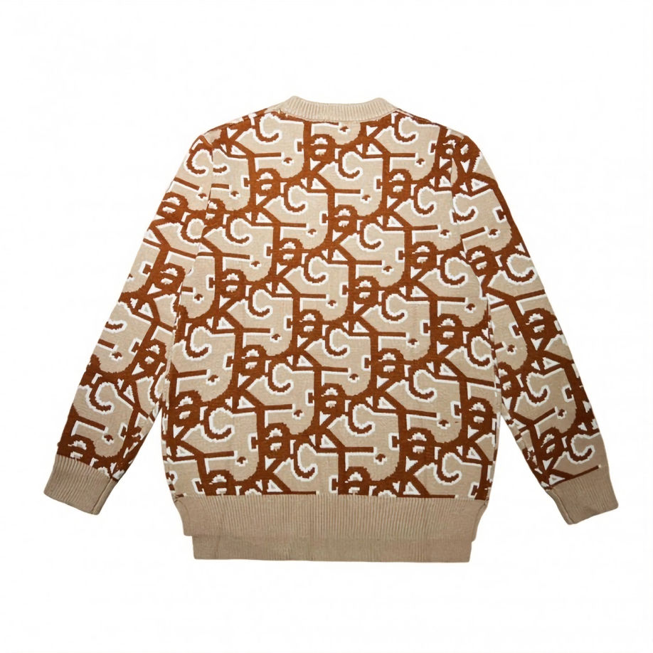 Креативный директор мужской линейки бренда Dior Ким Джонс и Трэвис Скотт объединили в коллекции эстетику известного модного дома и дизайн, характерный бренду Cactus Jack. Свитер из коллаборации Dior&Travis Scott выполнен из 100% шерсти в светло-коричневых тонах. Модель представлена в нестандартном фасоне: небольшие разрезы по бокам, благодаря которым удается подчеркнуть удлиненную заднюю сторону свитера. На свитер нанесен модерной принт коллаборации.