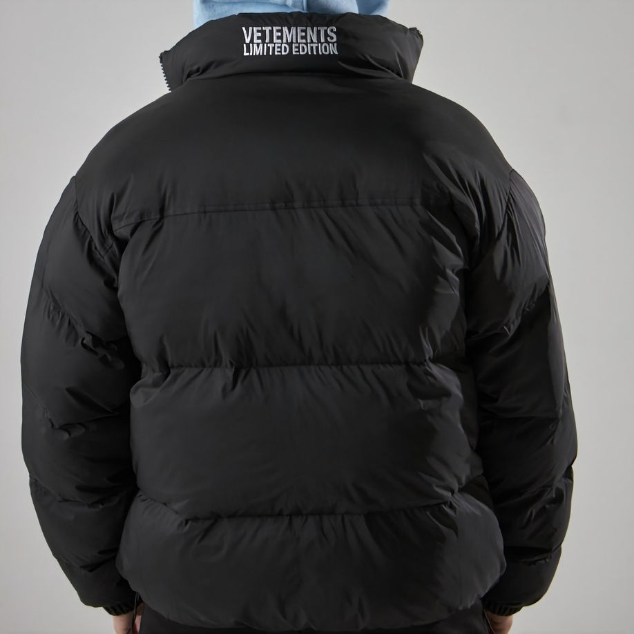 Чтобы выглядеть стильно этой зимой поможет черный пуховик Vetements . Модель выполнена из нейлона и наполнена натуральным утиным пухом. Воротник-стойка надежно защищает своих поклонников от холодного воздуха. Сзади на воротник размещен вышитый логотип бренда. Пуховик застегивается на молнию, а по бокам находятся косые карманы. Спереди на груди также оформленный логотип модного дома. Создайте свой крутой зимний образ от известного бренда.
